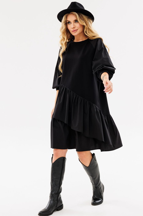 Платье женское А-силуэта с рукавом реглан. Вырез горловины круглый. По низу платья притачной волан из хлопка. Основа платья - трикотаж. Рукав на резинке.