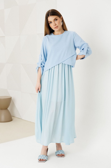 Платье макси. Лиф ассиметричный по низу, с имитацией запаха. Вырез горловины полукруглый, по спинке затежка на молнию. Рукава втачные, с манжетами и патами. Юбка на резинке, драпирующаяся, на подкладке, расширенного силуэта. Талия на резинке.
