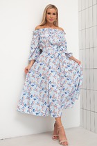 Платье свободного силуэта, отрезное по линии талии с цельнокроенным рукавом "летучая мышь". Лиф переда на запах. Юбка двойной колокол. По талии резинка. Платье на подкладке.