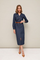 Платье-пиджак прилегающего силуэта, выполнен из теплой ткани. Застежка на петли-пуговицы,по переду действующие карманы, на рукавах шлицы. Изделие на подкладке.