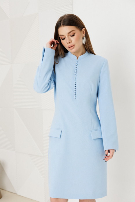 Платье женское приталенного силуэта, выполнено из костюмной ткани. По переду имитация застежки на петли-пуговицы, воротник стойка, на рукавах шлицы, по спинке застежка на молнию. Изделие на подкладке.