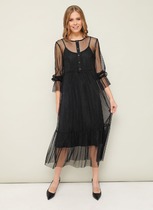 Платье женское полуприталенного силуэта с элементами отделки кожи . Отрезное по линии талии , с карманами. Рукав летучая мышь. В боковом шве тесьма-молния.