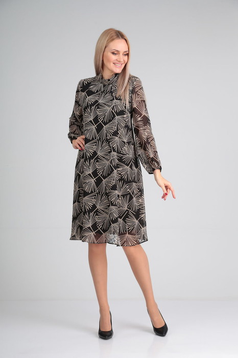 Стильное женское платье расклешёного силуэта с округлоым вырезом горловины на стойке . К стойке воротника пришита декоративная рюша. По спинке платья на стойке две декоративные пуговицы и маленький разрез ввиде капли. Платье шифоновое на трикотажной подкладке. В качестве декоративной отделки служит съёмный пояс. Низ рукава на резинке..