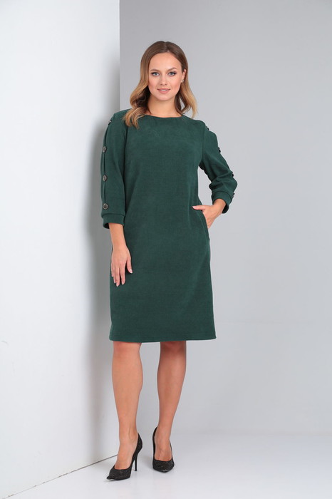 Трикотажное женское платье прямого силуэта, по спинке тесьма -молния.по переду карманы. Рукав со складкой и декоративными пуговицами, на манжете.