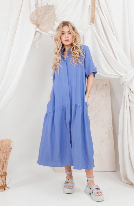 Льняное натуральное  платье современного кроя. Сборка по какеткам и по валану, рубашечный воротник, застежка потайная на петли и пуговицы, в боковых швах карманы.