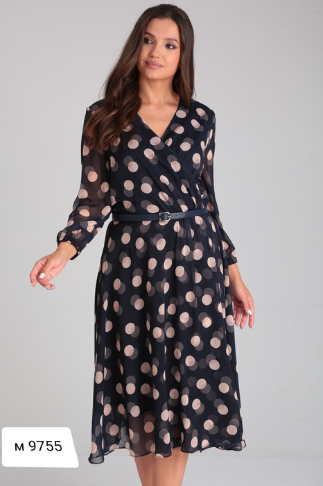 Шифоновое платье на трикотажной подкладке, V-образный воротник переходит в запах на линию талии. Платье отрезное по линии талии . Рукав  втачной , низ рукава на резинке. В  боковом шве тесьма молния.Пояс идёт в комплекте.
