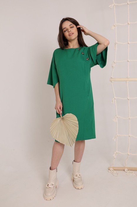 Яркий образ женского платья будет привлекать внимание окружающих.По спинке изделия застёжка-молния и разрез. По переду полукруглый вырез горловины,рельефные линии от проймы. Действующие карманы . Необычный рукав даёт свободу движения. Платье на любой сезон.