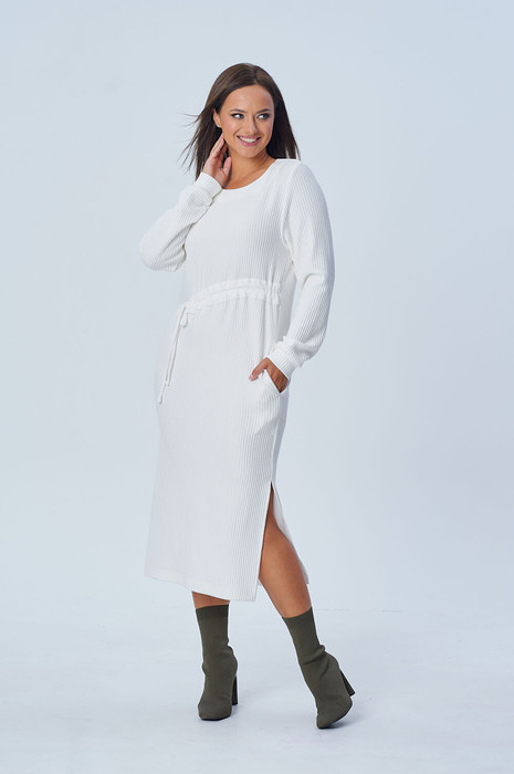 Стильное трикотажное платье с полукруглой горловиной ,карманы по боковым швам и разрезом с одной стороны и ещё с одним привлекательным акцентом по линии талии ввиде кулисы со шнурком. Это даёт возможность делать платье как полуприлегающим, так и свободного вида. Обладательница такого наряда будет себя чувствовать привлекательной в любой ситуации.