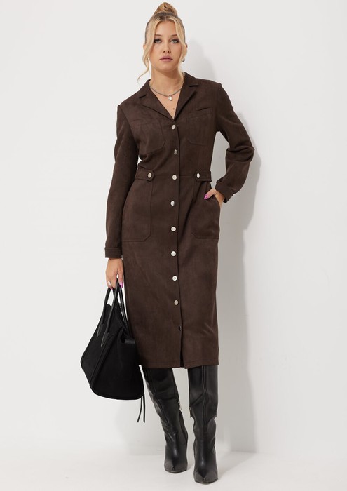 Платье женское полуприлегающего силуэта слегка зауженное к низу. Платье представлено из двух видов ткани из джинса на хлопковой основе и благородного замша. Застежка центральная на петли и пуговицы, воротник пиджачного типа. Платье отрезное по линии талии. На лифе полочки настрочены фигурные накладные карманы, на лифе и юбке обработаны талевые выточки, по юбке обработаны боковые накладные карманы. По спинке лифа обработана кокетка, также обработаны талевые выточки для более идеальной посадки. По линии талии по бокам паты, застёгивающиеся на петли и пуговицы. Рукава длинные втачные по низу притачная манжета на петлю и пуговицу.