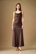 Платье женское из трикотажного полотна прямого силуэта длинной миди. Полочка и спинка цельнокроеные. Линия плеча спущена, рукав втачной по низу притачная манжета. В боковых швах для удобства обработан карман. Горловина обработана мягким воротником-стойкой.