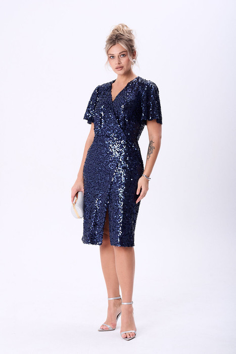 Платье из ткани в пайетки на подкладке полуприлегающего силуэта на запах длинной чуть ниже колена. Спинка цельнокроеная с талевыми выточками. По полочке платье отрезное по линии талии, по лифу по линии притачивания к юбке застрочены односторонние складки благодаря чему лиф садится на любую грудь. Нижняя часть полочки формирует  элегантный запах. Рукав короткий слегка расширенный к низу.