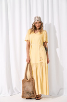 Платье выполнено из мягко трикотажа и легкой вискозы с эффектом жатки. Модель свободного силуэта благодаря чему будет идеально сидеть на любой фигуре, вырез v-образный. Основная часть выполнена из трикотажа, рукава и волан из жатки. Рукав короткий по окату присборен благодаря чему добавляет платью легкости. Волан присборен и по переду для удобства обработан разрез.