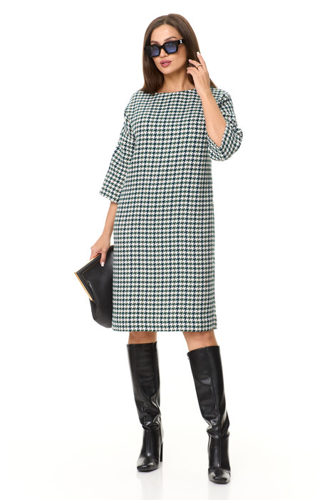Платье женское из теплой, текстильной ткани "гусиная лапка". Платье прямого силуэта длиной за колено. Перед цельный. Спинка со средним швом, застешка на потайную молнию, в низу разрез, горловина овальной формы. Рукав со спущенным плечом. Данная модель прекрасная покупка для осеннего сезона или холодной зимы. Длина платья: (48-52)-98 см., (54-56)-100см. Длина рукава: (48-52)-29 см., (54-56)-30см.