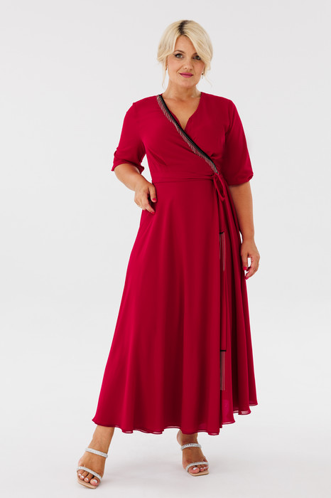 Элегантное  женское платье из блузочной ткани отрезное по линии талии. Благодаря своему крою прекрасно будет смотреться на любой фигуре, скрывая недостатки. Спинка и полочка -двойные.  Юбка-солнце-клеш (двойная). На лифе переда-нагрудные вытачки с проймы и по 2-е мягкие складки по талии. Спинка со средним швом и выточками.  В правом боковом шве лифа - отверствие для пояса,который протягивается и завязывается по переду.  Рукав втачной,одношовный, длиной 3/4. По низу рукава - мягкие складки. В качестве декора - металлизированная бахрома по горловине полочки  и по краю пояса.  Длина платья: верхняя часть: -(50-52)- 36см,(54-56)-37 см., юбка (50-56)-100см. Длина рукава: (50-56)-41 см.