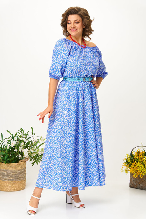 Платье свободного силуэта из хлопковой ткани- лучший выбор на лета. Рукав реглан 3/4 длины, низ на резинке. Горловина собрана на резинку. Платье отрезное по линии талии, на резинке. Юбка полусолнце. В комплект входит съемный пояс. Длина юбки: 93см . Длина рукава: 43см. Длина спинки: 42см.