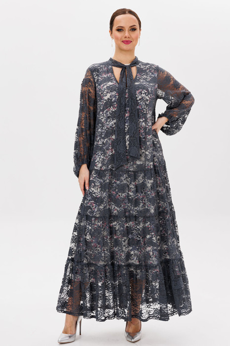 Вечернее платье макси из кружевного полотна, на подкладке, трапециевидного силуэта — дополнение любого образа. Отличный вариан на любое торжество. По горловине V-образный вырез и стойка переходящая в бант. Рукав расширенный к низу, на резинке, фигурный. По полочке и спинке идут 3 присобранных волана. Длина платья (по спинке):(50-54) 135см. Длина рукава: (50-60)-56см.