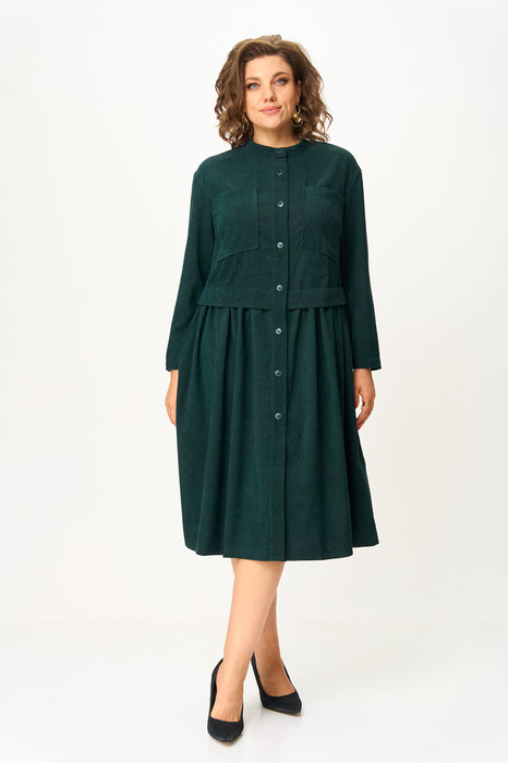 Платье прямого силуэта, длиной за колено, выполнено из вельвета в мелкий рубчик. Полочка платья с отрезной планкой по центру и застежкой на петли и пуговицы. Лиф платья отрезной , со складкой по низу, к срезу которой притачана юбка со сборкой. Полочка лифа с нагрудными вытачками и накладными карманами. Горловина круглой формы обработана воротником-стойкой. Пройма углубленной формы с рукавом рубашечного типа, рукав длинный, одношовный. В боковых швах юбки обработаны карманы.