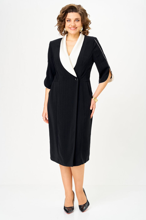 Полочка платья с вертикальными рельефами в верхней части и с отрезной боковой нижней частью, на которой выполнены карманы и складки в шве по талии. Застежка двубортная, на петлю и пуговицу. Горловина V-образной формы, обработана воротником типа “апаш” из отделочной ткани. Спинка со средним швом и вертикальными рельефами. Рукав длинной 3/4, втачной, двухшовный, с отделкой по краю.