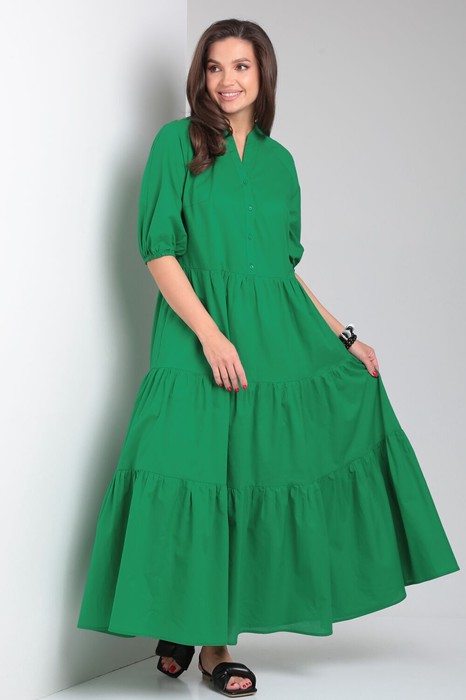 Платье женское прямого силуэта покроя реглан. Лиф переда с нагрудными вытачками, с планками и застежкой на петли и пуговицы. В боковых швах обработаны карманы. Спинка цельная. Рукав двухшовный с эластичной тесьмой по низу. Низ платья состоит из трех воланов, изделие без подкладки.