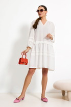 Изящное, нежное, летнее платье полуприлегающего силуэта. Это платье олицетворение красоты и удобства. Спущенный рукав, горловина со стойкой, нагрудная выточка, юбка по талии собрана на сборку.