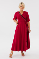 Элегантный V-образный вырез горловины подчеркивает линию шеи, добавляя образу женственности и утонченности. Удобная планка с застежкой на петли и пуговицы придает платью стильный акцент и позволяет легко регулировать посадку.
