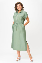 Нижняя часть - платье А-силуэта, расклешенное книзу, длиной до середины икры. Горловина округлой формы. По переду - нагрудные вытачки. По спинке - средний шов.