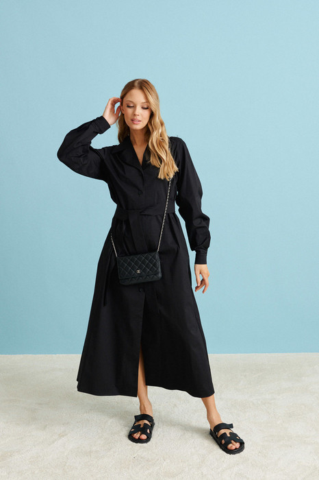 Платье прямого кроя выполнено их хлопкового полотна насыщенного черного цвета. Комфортное стильное платье идеально для каждодневных образов, подойдет на мероприятие, силуэтность платью придаст пояс, который входит в комплекте. Характеристики: Прямой крой, отложной воротник, застежка центральная на петли пуговицы, рукав слегка спущен по низу рукава манжета. В комплекте пояс из ткани основного изделия. Длина по спинке 131 см, длина рукава 77 см от края горловины.