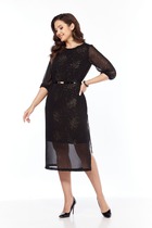 Платье полуприлегающего силуэта выполнено из плотного полотна с блеском черного цвета. Идеальный вариант платья для создания вечернего образа. Характеристики: полуприлегающий силуэт, подкладка, отрезное, отрез - стабильная вставка, фигурный вырез горловины, по переду функциональные пуговички, рукава объёмные верх и низ рукава на резинки, рукава могут быть спущены на плечи, застежка потайная тесьма молния в среднем шве заднего полотна, юбка в изделии свободного кроя с подгибом на резинке. Длина от плеча 127 см, длина рукава 61 см.