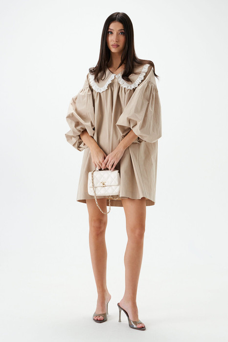 Платье прямого свободного кроя выполнено из хлопкового полотна цвета беж с акцентным воротником. Характеристики: прямой свободный крой, отрезное, отложной крупный воротник декорирован по периметру кружевом , рукав спущен , объемный, по низу рукава резинка. Длина по спинке 85 см, длина рукава от края горловины 63 см.