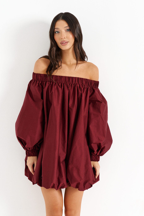 Платье прямого свободного кроя с полуоткрытими плечами, выполнено из бордового хлопкового полотна. Характеристики: прямой свободной крой, подкладка, верх и низ изделия на резинке, рукав обьемный, по низу рукова резинка. Длина по спинке 70 см, длина рукава от края горловины 58 см.