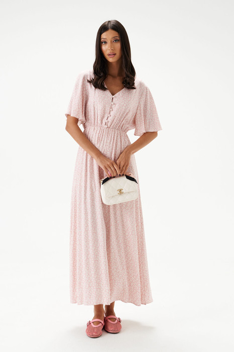 Платье полуприлегающего силуэта выполнено из нежно-розовой ткани с цветочным принтом.Характеристики: полуприлегающий силуэт, отрезное, отрез на резинке, V-образный вырез горловины, застежка - петли пуговички по передней части изделия, до отреза, пуговицы декорированы тканью основного изделия. Рукав втачной, короткий, свободного кроя. В боковых швах, по низу изделия разрезы.Подкладка до уровня разрезов. Длина по спинке 133 см, длина рукава 27 см