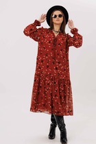 Платье - миди полуприлегающего силуэта выполнено из розового полотна с белым цветочным принтом. Горловина овальная. Отрез ниже талии на резинке. По лифу спинки вырез с завязками. Рукав спущенный, присборен на резинку. Длина платья 132 см, длина рукава 76 см