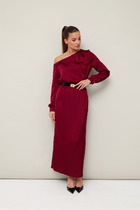 Платье - миди полуприлегающего силуэта выполнено из розового полотна. Горловина овальная. Отрез ниже талии на резинке. По лифу спинки вырез с завязками. Рукав спущенный, присборен на резинку. Длина платья 132 см, длина рукава 76 см.