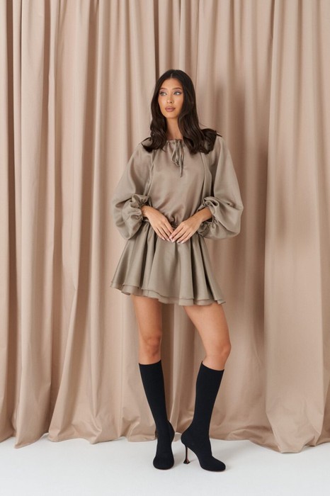Платье мини выполнено из ткани болотного цвета. Характеристика: овальный вырез на завязках, v-образный вырез, талия на резинке, без подклада, юбка двойная, рукав свободный, на манжете резинка 84см. Длин изделия по спинке, длина рукава 72см.
