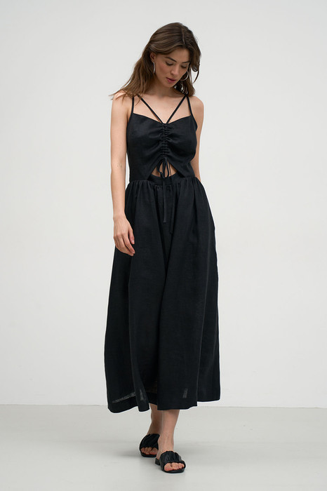 Смелый и запоминающийся образ обеспечит Вам стильное и необычное платье, выполненное из высококачественной льняной ткани. Платье полуприлегающего силуэта, на регулируемых бретелях. На переде обработаны вытачки и кулиска. Спинка также с вытачками. Изделие отрезное по линии талии с карманами в боковых швах. На спинке обработана застежка на потайную тесьму-молнию. Изделие н а хлопковой подкладке. . Возможно отличие фотографии по оттенку, связанное с разной цветопередачей монитора.