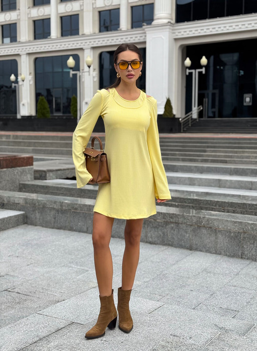 Платье в длине мини, выполнено из трикотажного полотна, который представляет собой ряд выпуклых вертикальных полос из «косичек». Верх платья обработан глубоким вырезом-лодочка и бретелями, имитирующими майку. Рукав расширяется к низу, по форме клеш. Платье хорошо тянется, идеально сядет н афигуру..