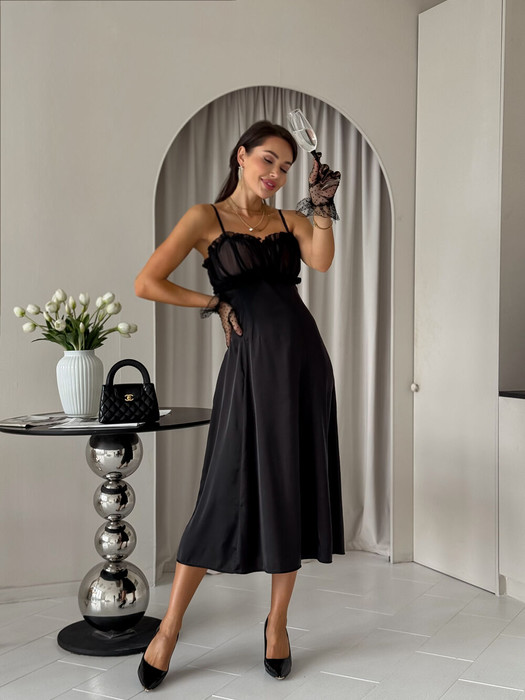 Ультра женственное платье из лёгкой атласной ткани. Подчеркнутая линия груди в виде чашечек с изящными шифоновыми вставками. Тонкие атласные лямки. Застежка на потайную молнию. Платье подчеркивает силуэт. Длина миди. Идеальный вариант для свидания и особых случаев.