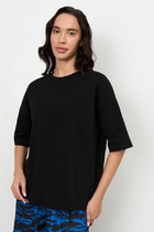 Двухслойное платье из жаккарда на шифоновой основе с бахромой, прямого силуэта, спущенным рукавом и круглой горловиной. По бокам высокие разрезы, на переде ажурная нашивка. Нижнее платье из золотистого трикотажа, без рукава, с карманами по бокам.