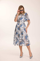 Платье женское трикотажное, свободное "оверсайз", со спущенной проймой и 3/4 рукавом, вырез горловины полукруглый с планкой, в боковых швах-карманы и разрез слева.
