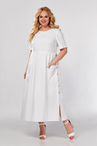 Платье женское из плательной ткани, полуприлегающего силуэта, под пояс из той же ткани, вырез горловины полукруглый, рукав 3/4 длины на спущенной пройме, карманы в боковых швах, по переднему полотнищу юбки-складки, застежка по среднему шву спинки на молнию, изделие без подкладки.