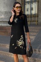 Женское нарядное платье выполнено из плательно-костюмной однотонной ткани с блестящим  напылением. Перед со средним швом, заканчивающимся разрезом.Спинка цельная.Рукава цельнокроеные с широкими двойными манжетами, длиной 3/4.Вырез горловины по переду круглый ,а по спинке  V-образный с планкой и декоративной пластинкой, обработан обтачками.