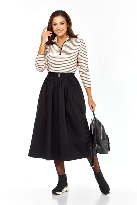 Верхняя часть платья выполнена из трикотажного полотна, с центральной застёжкой на металлическую тесьму-молнию.Спинка цельная.Рукава втачные длинные одношовные.Круглый вырез горловины обработан двойным притачным воротником-стойкой.