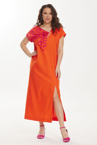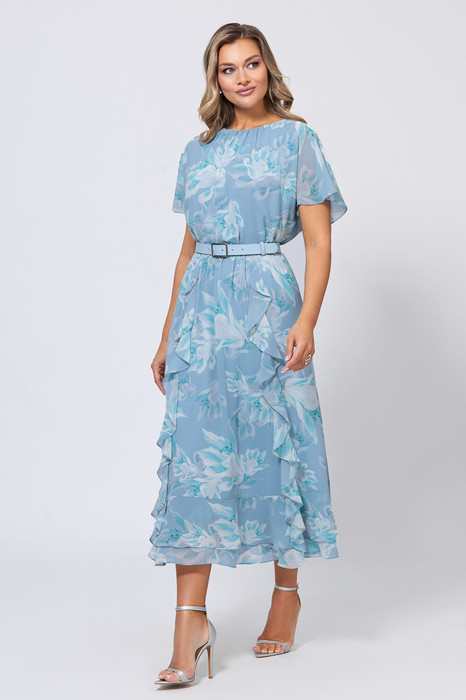 Нарядный летний вариант, идеально подходящий как для вечерних мероприятий, так и для дневных прогулок. Легкая ткань обеспечивает комфорт даже в самые жаркие дни, а универсальный дизайн позволяет комбинировать модель с различными вариантами обуви и аксессуаров. Платье отрезное по линии талии, со скрытой резинкой, обеспечивающей удобную посадку. Воланы по переду и низу юбки подчеркивают романтичный стиль, а цельнокроеные рукава превращаются в изящные крылышки, добавляя образу нотки нежности и воздушности. Модель с круглой формой горловины, со сборкой по переду и застёжкой на петли и отделочные пуговицы по спинке. Лиф платья и расклешенная юбка продублированы подкладкой из вискозы. Линия талии красиво подчёркнута поясом-ремнём с пряжкой.