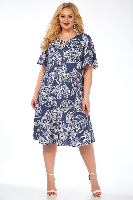 Платье женское А-силуэта. Перед с центральным швом и отделочной строчкой, по низу с приточным валаном. Рукав втачной свободного кроя. Перед и валан украшены пуговицами.