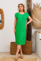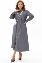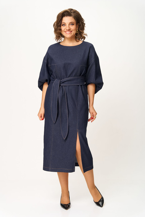Платье прямого силуэта, с отрезными бочками и разрезом по низу платья. Застежка на декоративную молнию в центральном шве спинки. Горловина круглая. Рукава со спущенной проймой. Рукав широкий, с асимметричным низом, собранным на резинку.