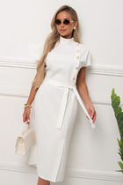 Платье «А» образного силуэта с рельефными швами по переду и спинке. Горловина круглая с цельновыкроенной стойкой. Застежка на тесьму молния в центральном шве спинки. Рукава втачные, со сборкой по низу, на узком манжете с застежкой на петлю и пуговицу.