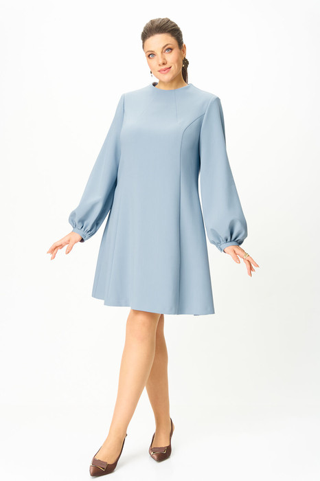 Платье «А» образного силуэта с рельефными швами по переду и спинке. Горловина круглая с цельновыкроенной стойкой. Застежка на тесьму молния в центральном шве спинки. Рукава втачные, со сборкой по низу, на узком манжете с застежкой на петлю и пуговицу.