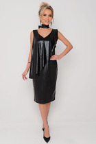 Элегантное женское платье, выполнено из плательной ткани с небольшим блеском. Платье полуприлегающего силуэта, горловина круглая. По спинке в центральном шве разрез возле горловины с завязкой и разрез по низу. Платье без подкладки.
