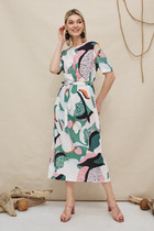 Платье прилегающего силуэта. Горловина круглая, по центру переда шов, по низу шва разрез, с левой стороны по линии талии декоративный элемент. Рукава втачные, фантазийной формы.