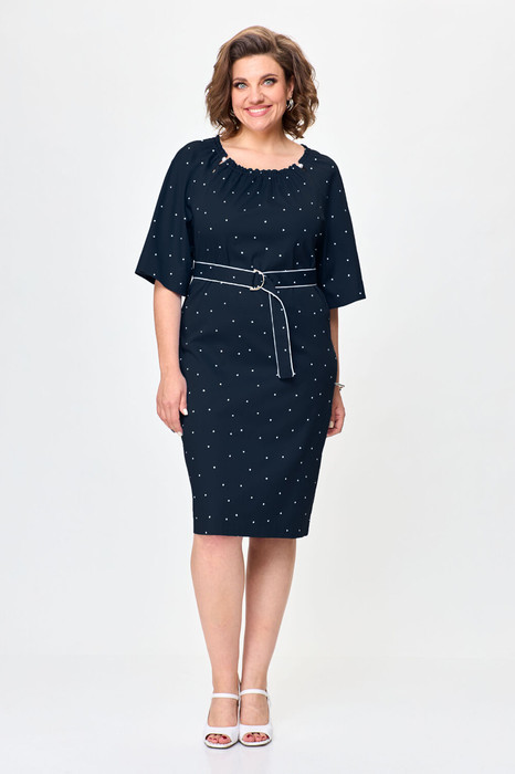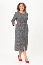 Элегантное женское платье выполнено из хлопка с содержанием эластана. Платье полуприлегающего силуэта. Горловина круглая, собрана на резинку с декоративными бусинам. Застежка в среднем шве спинки на тесьму молния. Рукав реглан, расширенный книзу, длина до локтя. В комплект ходит съемный пояс на пряжке и с декоративным кантом. Платье без подкладки.